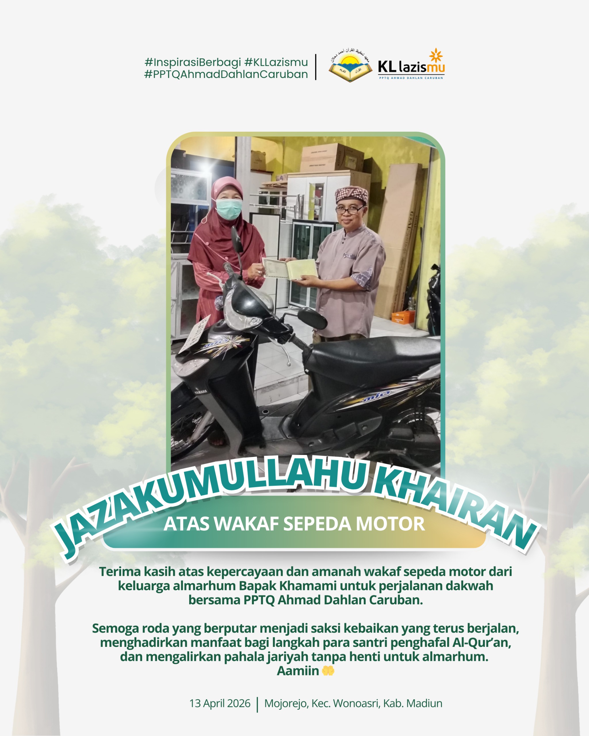 Alhamdulillah, satu lagi kabar gembira untuk mendukung pergerakan dakwah dan aktivitas bermanfaat di PPTQ Ahmad Dahlan Caruban. 😊 Kemarin (13/4) telah diterima wakaf satu unit motor Yamaha Mio langsung dari Ibu Khamami kepada Mudir PPTQ Ahmad Dahlan Caruban, Bapak Rochmad Eko Herjatno. Bersama-sama, mari kita doakan kebaikan untuk Alm Bapak Khamami sekeluarga. 🤲 “Semoga Allah […]